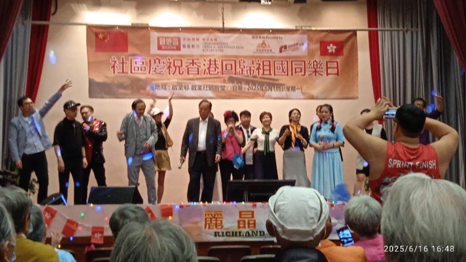 社區:今午於社區會堂舉辦慶回歸同樂日,唱歌載舞玩遊戲盡興.