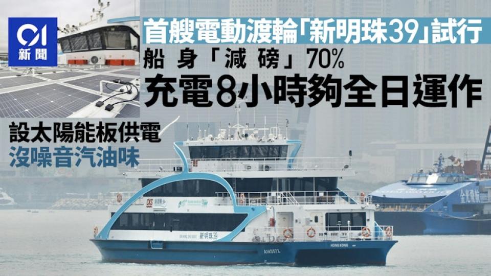 首艘電動渡輪(新明珠39)試行,船身(減磅)70%,充電8小時夠全日運作.