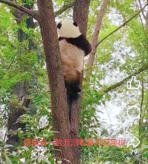谭爺爺一臉宠溺看着花花爬树