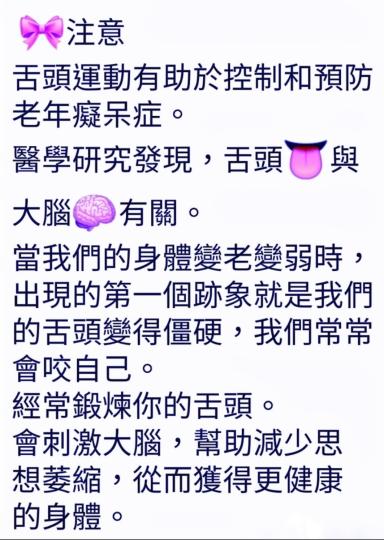 (舌頭)運動,有助於控制和預防老年癡呆症,科學研究發現,舌頭與大腦有關!請大家細看內文。