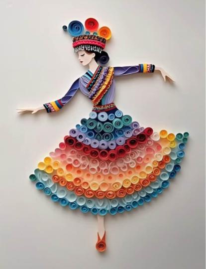 用彩紙條卷成小圈可以拼出優美的民族舞者。