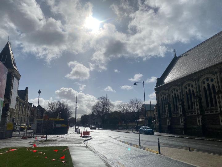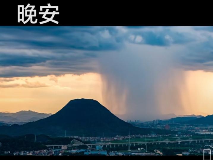 局部降雨現象清晰地展示了雨水集中在特定區域下降,形成了一條明顯的雨柱,這種現象在氣象學上稱為「雨幡洞」或「穿洞雲」,通常發生在卷積雲或高積雲中。