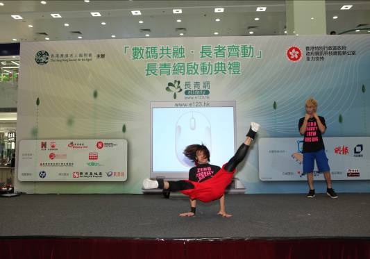 強勁音樂配合嘻哈舞蹈,再加上耆康會資深職員兼大會司儀徐德安先生的饒舌表演,為「長青網」啟動典禮揭開序幕。