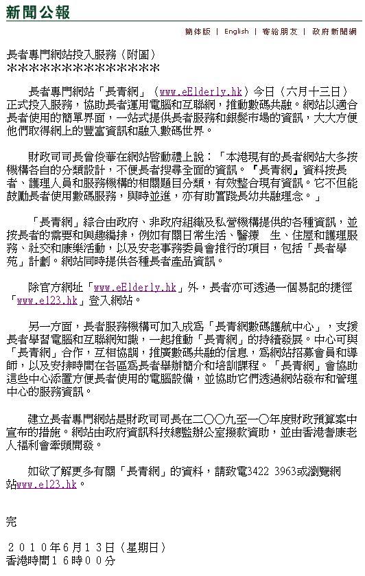 長者專門網站「長青網」(www.eElderly.hk)今日(六月十三日)正式投入服務,協助長者運用電腦和互聯網,推動數碼共融。網站以適合長者使用的簡單界面,一站式提供長者服務和銀髮市場的資訊,大大方便他們取得網上的豐富資訊和融入數碼世界...