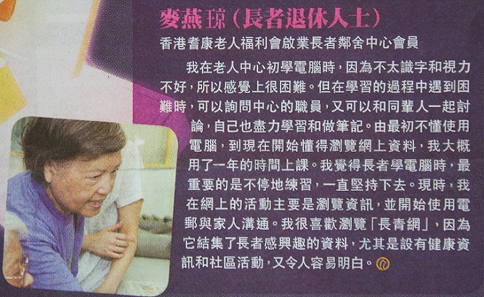 我在老人中心初學電腦時,因為不太識字和視力不好,所以感覺上很困難。但在學習的過程中遇到有困難時,可以詢問中心的職員,又可以和同輩人一起討論,自己也盡力地學習和做筆記。由最初不懂使用電腦,到現在開始懂得瀏覽網上資料,我大概用了一年的時間上課。我覺得長者學電腦時,最重要的是不停地練習,一直堅持下去。現時,我在網上的活動主要是瀏覽資訊,並開始使用電郵與家人溝通。我很喜歡瀏覽「長青網」,因為它結集了長者感興趣的資料,尤其是設有健康資訊和社區活動,又令人容易明白。