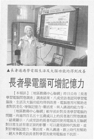 一項調查訪問了400位55歲以上的長者,當中有八成五長者說,有興趣學電腦,調查顯示適當運用電腦,可以訓練長者手眼協調能力,保持頭腦靈活,甚至增強記憶力,又不會與時代脫節。
