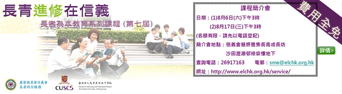 長青網誠意向你推介我們其中一間數碼護航中心「基督教香港信義會沙田多元化老人社區服務中心」與「香港中文大學專業進修學院」合辦的「長者進修在信義」長者為本教育系列課程。課程不但以第三齡人士為對象,教學形式及內容更十分多元化,讓第三齡人士有終身學習與及擴闊視野的機會,藉此展開退休生活新階段,真正享受黃金歲月。