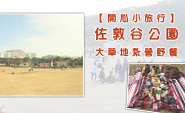 每逢周末均有大批市民前去佐敦谷公園親親大片草地!草地上你會見到有輕便帳幕、地蓆處處,有朋友們在彈結他、小孩在踢波、一家幾口玩飛碟、放風箏、吹肥皂泡、年輕人影畢業相,秩序井然。儘管剛學爬學走的寶寶,也可自由自在地在特設的小梯級和滑梯上玩耍!