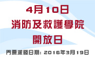 消防及救護學院開放日將於2016年4月10日(星期日)舉行,位於將軍澳全新的消防及救護學院於2016年第一季啟用,新學院設有多項不同場景和不同種類事故的模擬設施,提供多元化的救援訓練,屆時消防和救護學員將有更多一同操練的機會,提高他們在緊急事故中的應變及協調能力,從而更有效地發揮救援工作的效率。