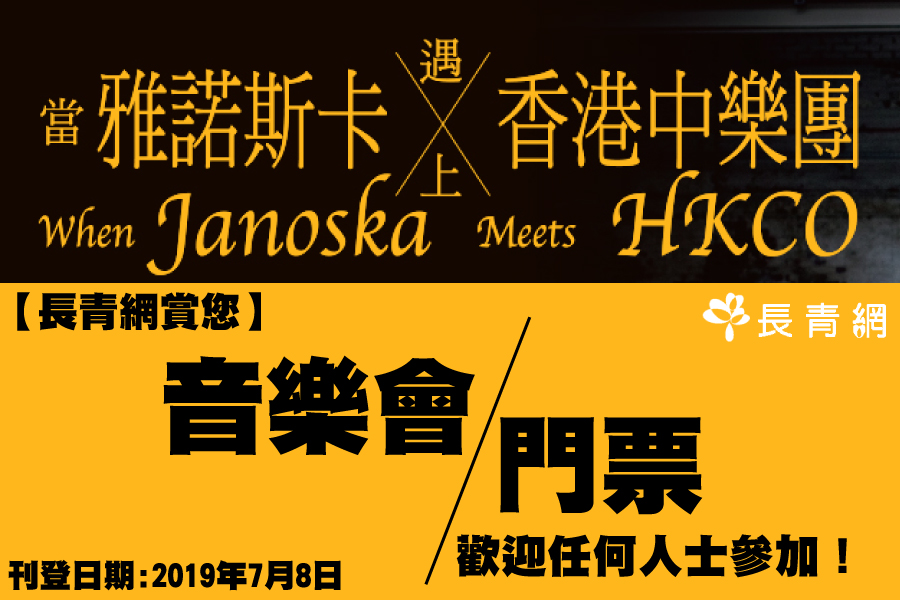凡有興趣現場感受精湛演出的粉絲們,請於即日起至2019年07月10日正午12時期間,致電長青網登記,先到先得。成功登記,每人可獲得《當雅諾斯卡遇上香港中樂團》音樂會門票2張。
