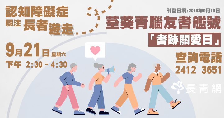 為響應世界認知障礙症日,荃灣及葵青區多間長者中心於2019年9月21日合辦以「關注認知障礙症長者遊走」為主題的公開活動。活動當日將有流動宣傳車行走荃葵青區不同地點,宣傳長者防遊走訊息,亦會大派禮物。同日下午於荃灣及葵青區多間長者中心內舉行護老者防遊走講座、攤位遊戲及即場協助填寫長者平安卡,亦會派發紀念品,歡迎所有社區人士參與活動。