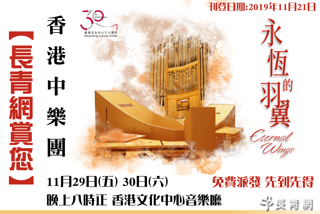 凡有興趣現場感受精湛演出的粉絲們,請於即日起至2019年11月29日期間,親身前往長青網辦公室登記,先到先得。成功登記,每人可即時免費獲得香港中樂團《永恆的羽翼—香港文化中心30周年誌慶音樂會》門票2張。
