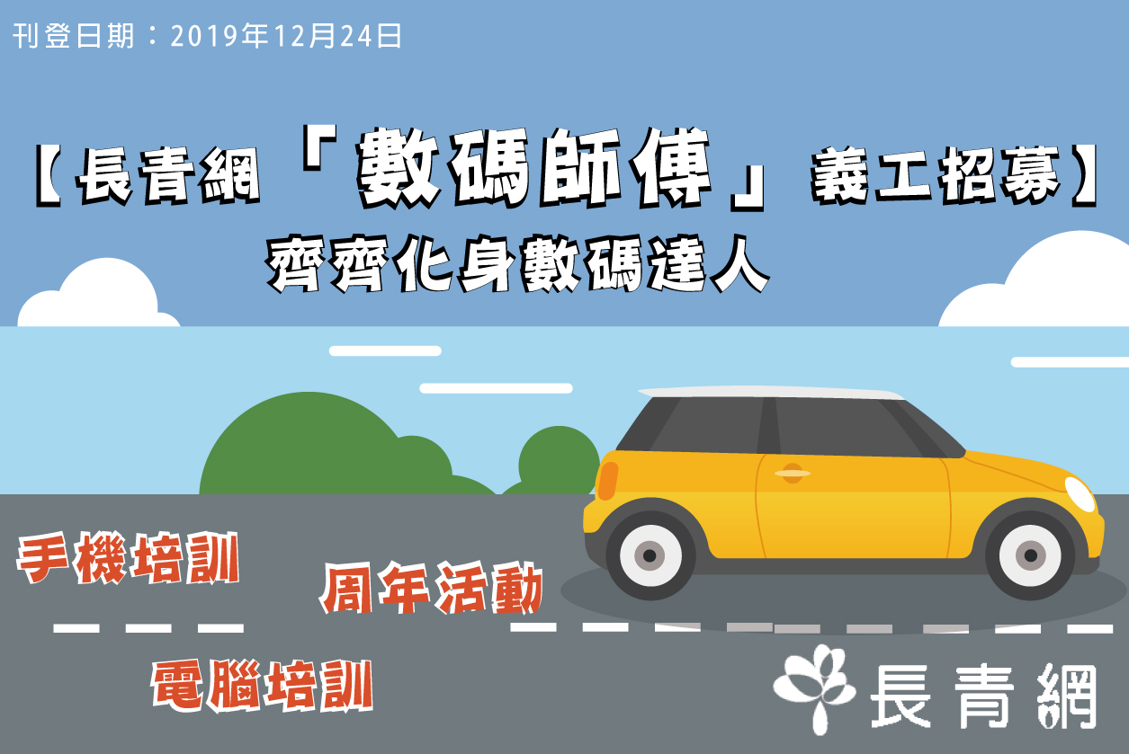長青網現正招募喜歡上網、喜歡分享和同聲同氣的您成為「數碼師傅」義工,在長青網分享長者生活資訊,如飲食、旅遊心得,並協助推廣長青網。