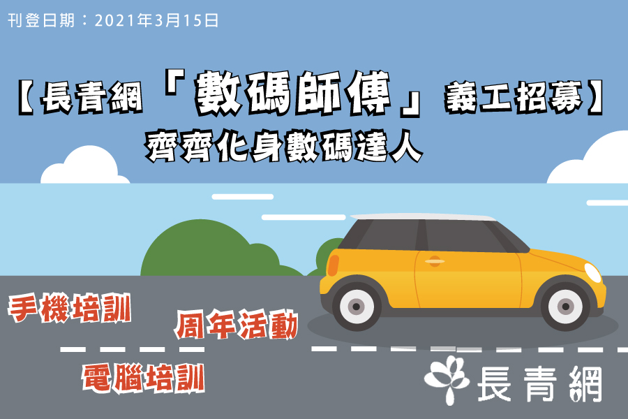 長青網現正招募喜歡上網、喜歡分享和同聲同氣的您成為「數碼師傅」義工,在長青網分享長者生活資訊,如飲食、旅遊心得,並協助推廣長青網。