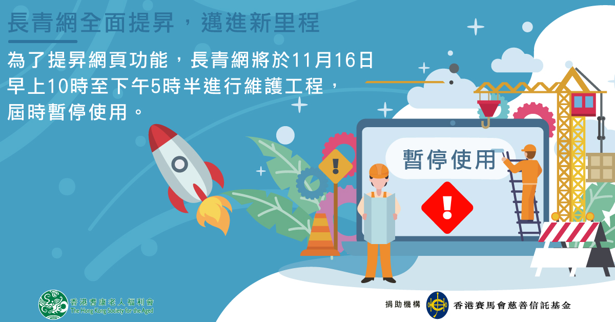 為了讓「長青網」 (www.e123.hk) 及「智有腦」運作更暢順 ,「長青網」及「智有腦」的伺服器將於 11月16日(星期二) 上午10:00 至 下午5:30 進行系統升級,屆時「長青網」與「智有腦」的網站及應用程式將於上述時間暫停服務。