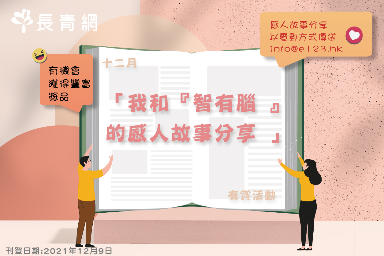 - 敬請報名者留意:長青網有機會從中挑選最為感人肺腑的故事,邀請該故事的分享者出席2022年1月11日的「智有腦」發佈會,親身分享和「智有腦」的生活點滴和動人故事。如報名者參加是次宣傳推廣活動則代表同意所有發佈的文字及影像/圖片(包括肖像權)將准予香港耆康老人福利會作活動宣傳推廣之用(傳媒採訪)。