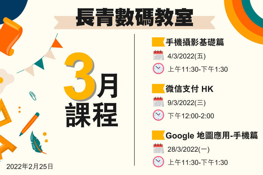 - 按下連結:https://wa.me/85221105650?text=訂閱最新推廣資訊,立即傳送訊息「訂閱最新推廣資訊」至長青數碼教室官方WhatsApp 2110-5650;或