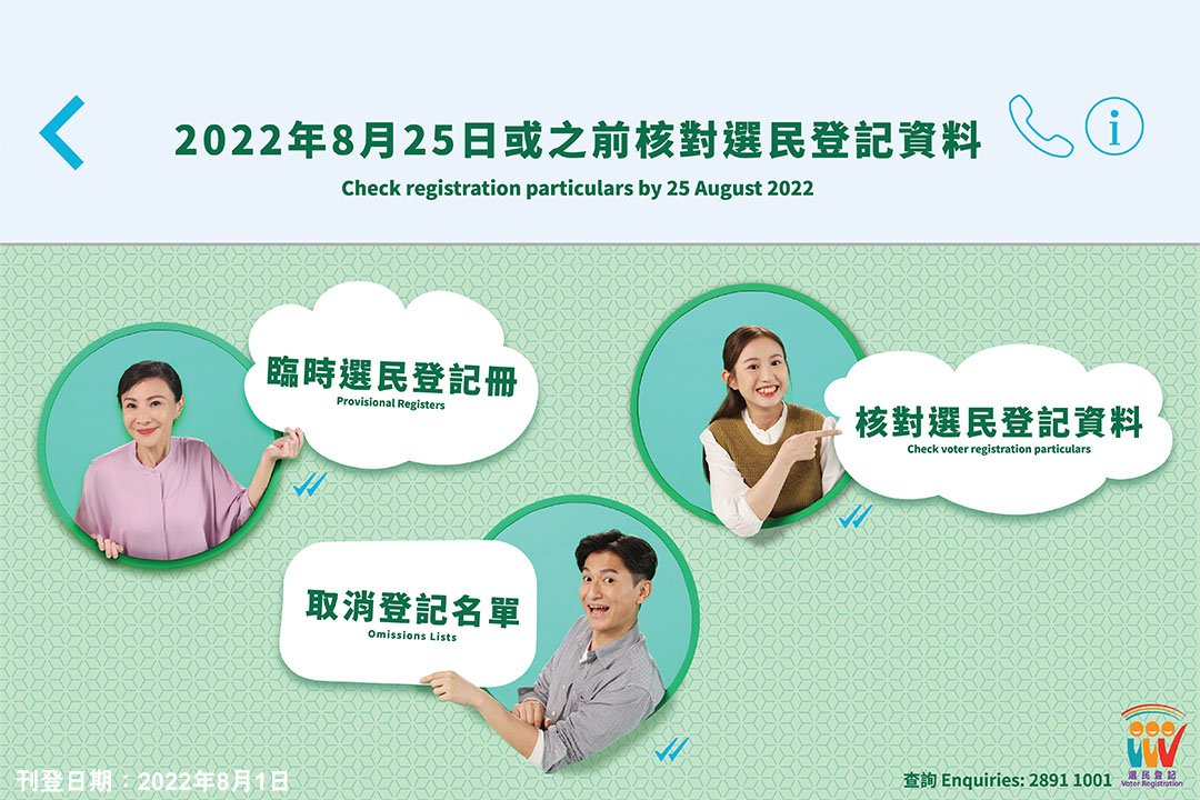 二○二二年地方選區、功能界別及選舉委員會界別分組臨時選民/投票人登記冊及取消登記名單已於八月一日發表。