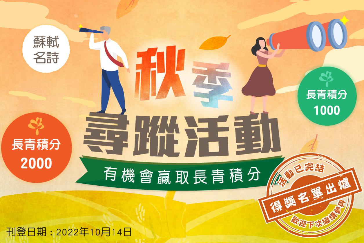 踏入十月份,長青網將於2022年10月17日至11月4日舉辦「秋季尋蹤活動」,與各位喜迎初秋。
