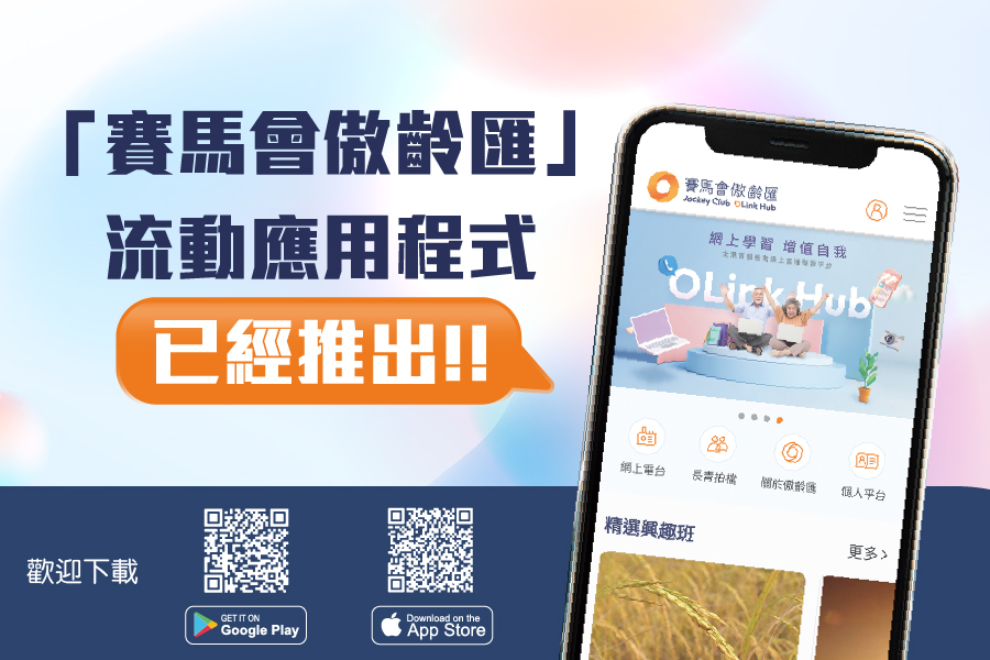 香港耆康老人福利會於2022年獲「香港賽馬會慈善信託基金」撥款,推行為期三年的「賽馬會傲齡匯」計劃,建立全港首間網上虛擬長者中心,為中高齡人士及護老者提供多元化的網上互動平台、活動及課程,提升他們使用資訊科技的自主性。平台提供多元化專業課程,讓長者學習不再受時間及地域限制。「賽馬會傲齡匯」更推出手機應用程式,已正式在App Store 及 Google Play商店上架,希望透過簡單清晰的程式介面,方便大家使用,實踐隨時隨地網上學習。 如有任何問題,歡迎致電2344 5123 與耆康會飛躍天地職員聯絡。