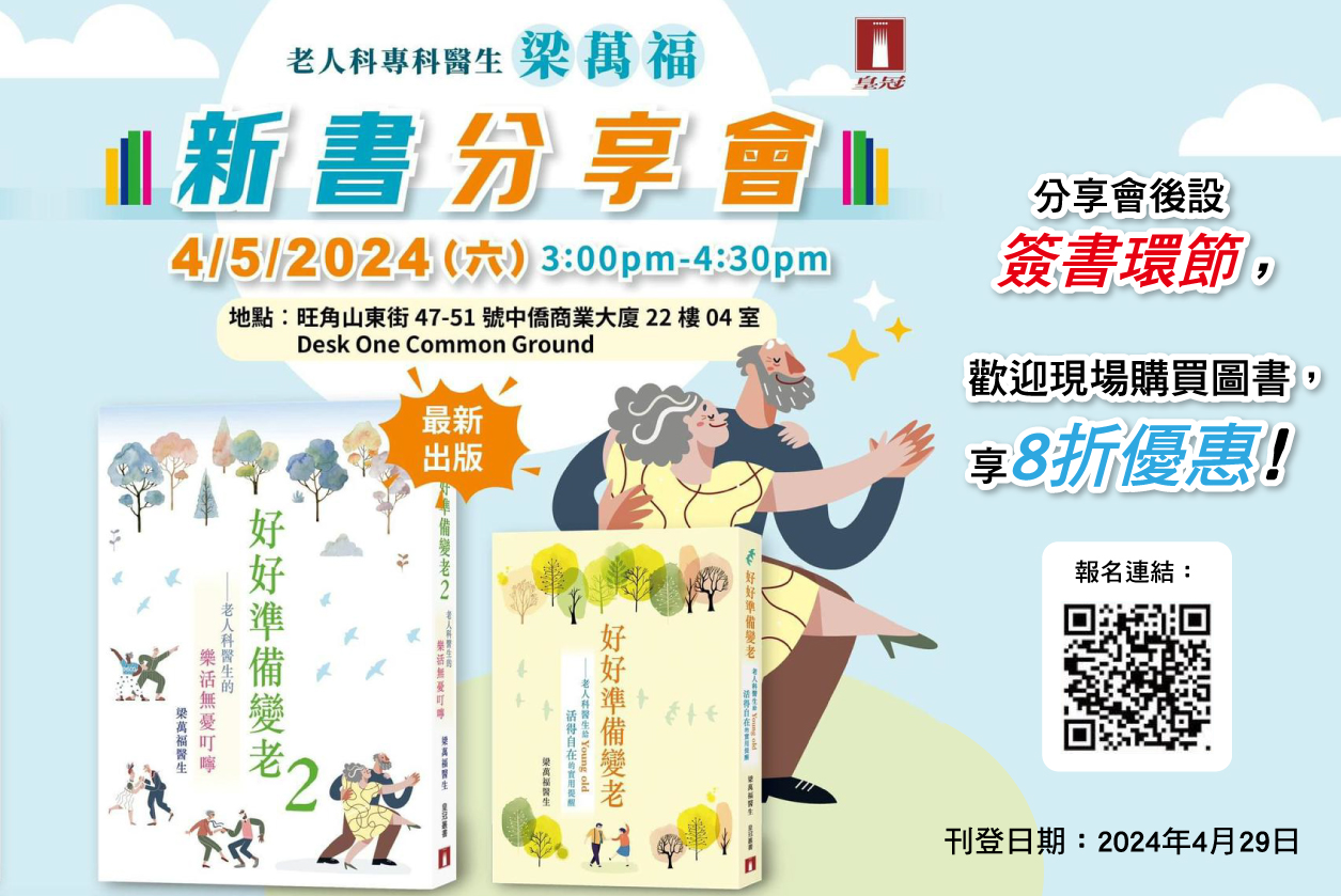 暢銷作品《好好準備變老:老人科醫生給Young Old活得自在的實用提醒》的作者梁萬福醫生,最新作品──《好好準備變老2:老人科醫生的樂活無憂叮嚀》出版後廣受一眾讀者歡迎,現已加印至第2版!