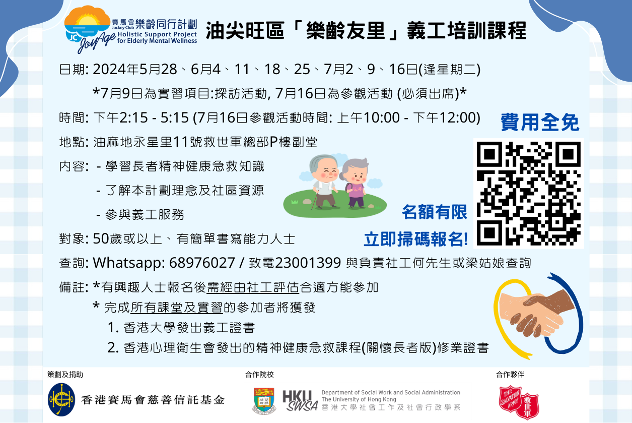 本課程內容包括精神健康急救(關懷長者版)課程同介紹賽馬會樂齡同行計劃理念,俾參加者學習精神健康急救嘅知識,學習關懷長者嘅知識技巧同社區資源,照顧自身心理健康、同時幫助其他區內有需要嘅長者,課程內容豐富,名額有限,有興趣盡快報名!