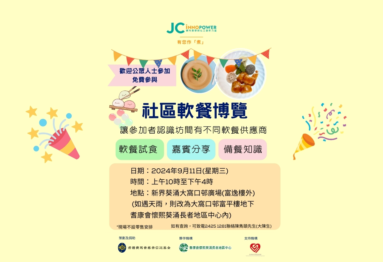 為讓照顧者認識市面上不同的軟餐供應商,香港耆康老人福利會推行的「賽馬會社工創新力量:有您作『煮』計劃」將於2024年9月11日(三)舉辦「社區軟餐博覽」,邀請了各大軟餐供應商以「軟餐夥伴」的身份介紹最新軟餐款式及提供試食,讓有吞嚥障礙的長者仍能有尊嚴地選擇「啱口味」的菜式,更提供即場訂購服務,讓照顧者能為患者重整膳食安排,節省烹調時間,紓緩備餐的壓力。