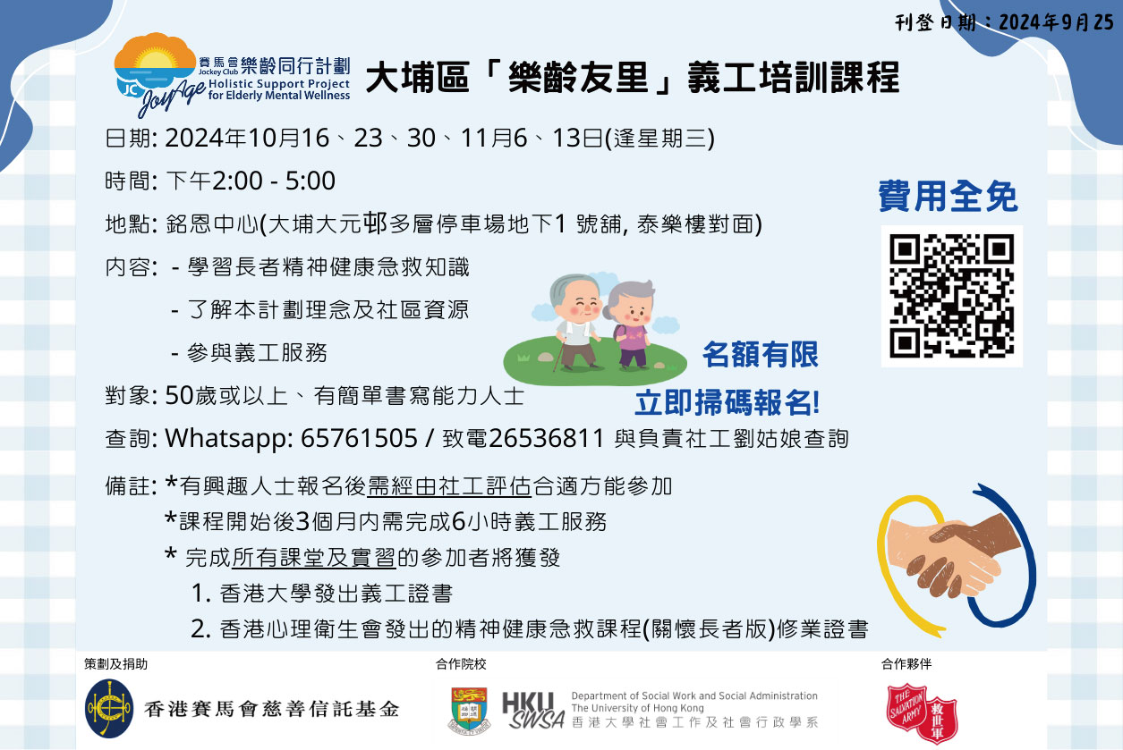 課程將會教授長者精神健康相關知識同應用方法。內容非常豐富! 提升自身心理健康嘅同時,更能學以致用,幫助身邊有需要嘅長者,喺社區入面進一步推廣精神健康。咁有意義嘅事,一於即刻報名啦!同埋快啲搵埋有興趣嘅親友一齊黎報名啦!