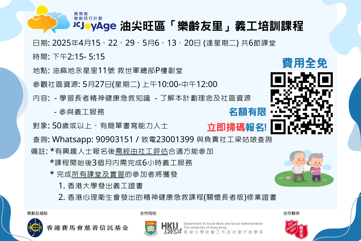 本課程內容包括精神健康急救(關懷長者版)課程同介紹賽馬會樂齡同行計劃理念,俾參加者學習精神健康急救嘅知識,學習關懷長者嘅知識技巧同社區資源,照顧自身心理健康、同時幫助其他區內有需要嘅長者,課程內容豐富,名額有限,有興趣盡快報名!