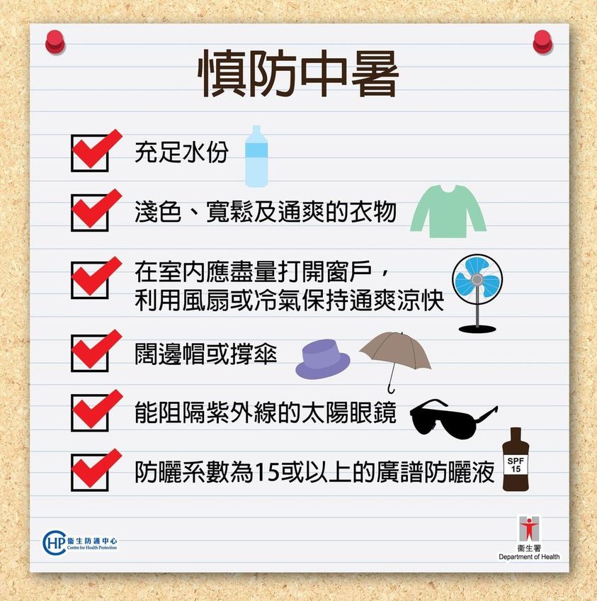 衞生署衞生防護中心提醒市民特別是進行戶外活動的人士,天氣酷熱,應採取適當措施,預防中暑及曬傷。