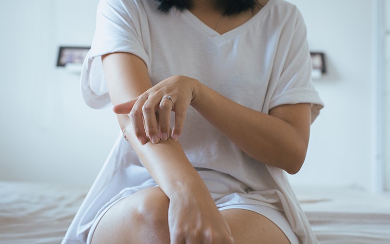 蔡小姐一直受濕疹問題困擾,主要集中於手肘位置,皮膚狀況時好時壞,反反覆覆至今已7年有多,令她感到十分困擾。「一到轉季天氣,病情就更加嚴重,除了乾燥、脫皮、痕癢,患處更會變得粗糙、變硬,甚至出現紅腫、滲水現象。」蔡小姐憶述,每次發作都會令她難以入眠,經常要用繃帶或毛巾將患處包起,以免抓癢時傷害到皮膚。