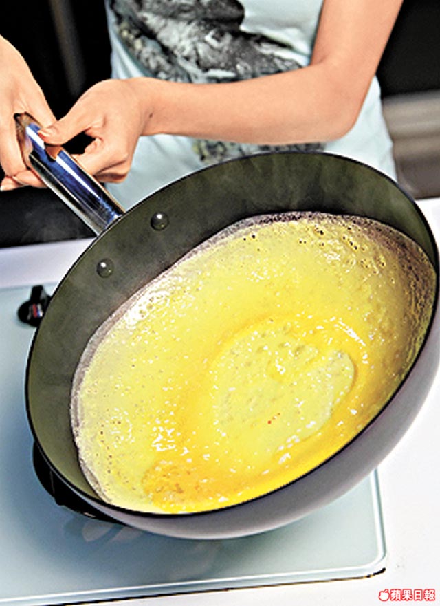 加入蛋液後便要把鑊搖勻,並要搖到稍高位置,讓蛋液沾到鑊邊。