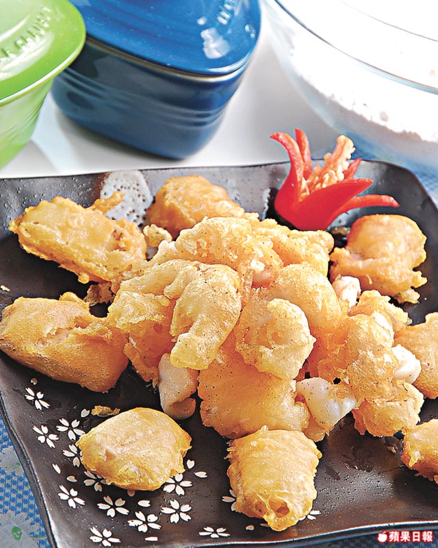 椒鹽魷魚外層炸到脆卜卜,睇到都想食。原來要做到這麼香脆,開炸漿都有些秘訣,一於請陳鋼師傅示範給大家看。 材料:麪粉 300克、泡打粉 19克、生粉 19克、水 500毫升、鹽 1/2茶匙、油 60毫升 做法: 1.麪粉加泡打粉及生粉拌勻,邊慢慢加水邊拌勻,不可攪到粉末完全混和,這個過程大約要攪拌 2至 3分鐘。 2.然後再下鹽,讓炸出來的脆皮有少許味,再加油拌勻,加了油的炸漿炸出來會更鬆化,將炸漿置室溫 15分鐘,將食材蘸上炸漿。 3.燒滾油約 80℃,將已蘸炸漿的材料放入熱油,炸至金黃浮起即成。 資料來源︰蘋果日報2010年3月15日 0 0 0 書籤 留言 (0) 登入即可留言