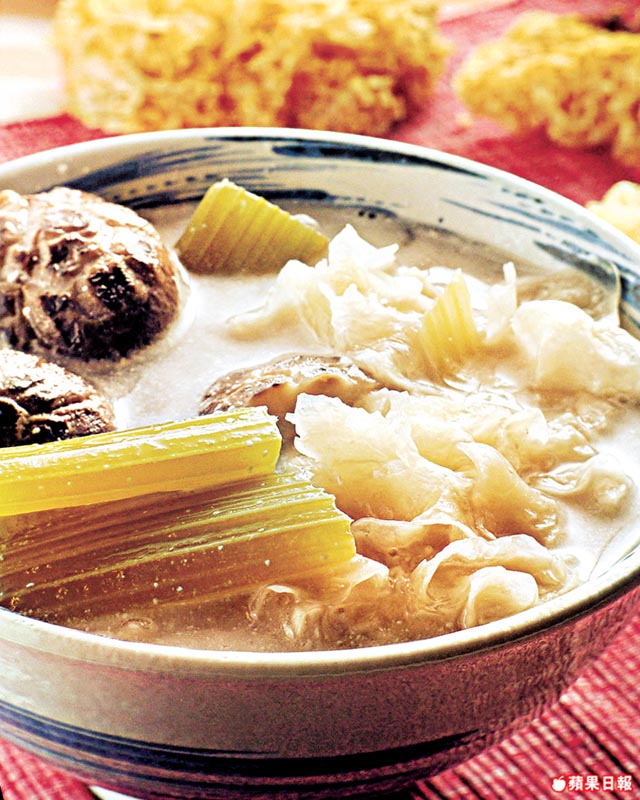 份量: 4人 03hr00min 製作難度:★★★☆☆ 冬菇屬高蛋白低脂肪食物,加上潤肺潤膚的銀耳及清香的椰汁,是非常滋潤的湯水,對非常敏感且乾燥的肌膚特別有效。 材料 冬菇/銀耳各 6朵、西芹 2條、椰汁 250毫升、薑 2片、鹽 1茶匙、水 10-12碗 做法 1.銀耳加水浸泡 1小時至發大,分成小份,去掉硬心。 2.將已洗淨的西芹切段。冬菇去蒂,加水浸泡 1小時至軟。 3. 將薑、銀耳、冬菇、西芹、椰汁及水放入煲中,先以大火煮滾 10分鐘,轉小火煲 2小時,加入鹽調味即可。 資料來源︰蘋果日報2010年10月7日 0 0 0 書籤 留言 (0) 登入即可留言 wah2021 2025年09月10日 09:59 thx 0 舉報