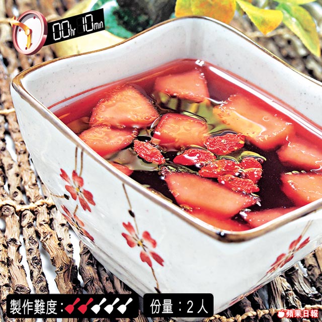 洛神花味道帶少許酸,本身有利尿去水腫功效,加上蘋果,便變成酸酸甜甜的蘋果茶,好味之餘,去水威力更會加倍! 材料 洛神花乾 10朵、蘋果 1個、杞子 1湯匙、冰糖適量、水 3碗 做法 1.蘋果去皮、對切、去核,再切成小粒。 2.洛神花和杞子分別放入水略浸洗,盛起備用。 3.煲滾水,加入蘋果、杞子、冰糖和洛神花乾,煲滾後收細火煲 5分鐘即可飲用。 貼士 煲這個蘋果茶可以用較熟的蘋果,蘋果香味會較出。 資料來源︰蘋果日報2011年4月20日 0 0 0 書籤 留言 (0) 登入即可留言