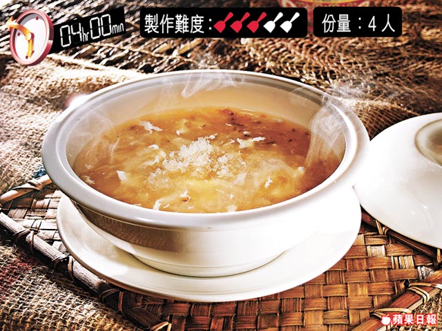 燕窩/黃耳(切絲)/竹笙(切段)各 35克、蘆薈 80克、雞湯 600毫升、蛋白 2隻