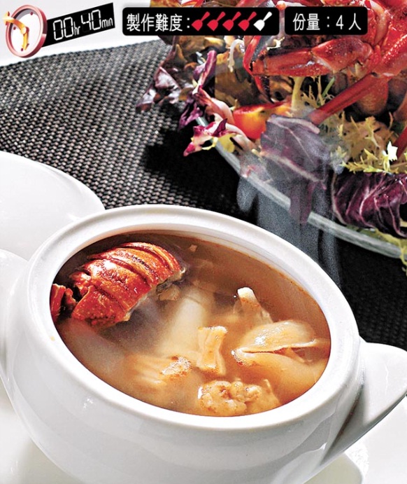 龍蝦跟龍躉,還加入元貝和花膠,啖啖鮮味濃郁! 材料 龍躉脊肉 100克、龍蝦(斬件) 180克、花膠(汆水) 40克、元貝(已浸) 4粒、花菇(已浸開半) 2隻、金華火腿 2片、老雞上湯 400毫升 做法 1.龍躉肉和龍蝦分別汆水備用。 2.燉盅放花菇、元貝、金華火腿、老雞上湯,加蓋,隔水以細火先燉 2小時。 3.加龍躉肉和龍蝦,加蓋再繼續隔水以細火多燉 2小時。 4.開蓋,放入花膠,再細火燉 3分鐘即可。 資料來源︰蘋果日報2011年07月22日 0 0 0 書籤 留言 (0) 登入即可留言 wah2021 2025年09月15日 13:27 thx 0 舉報