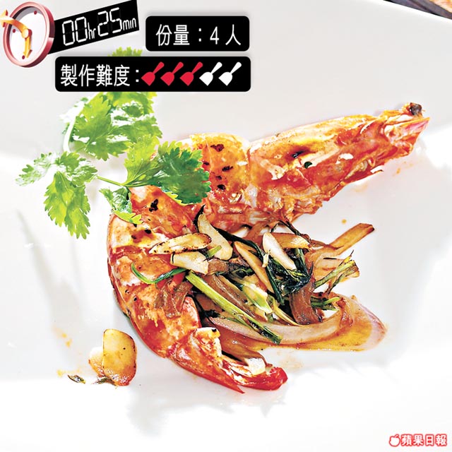 大蝦(剪腳剪鬚) 400克、葱(切段) 3條、薑片/蒜片/洋葱絲各 20克