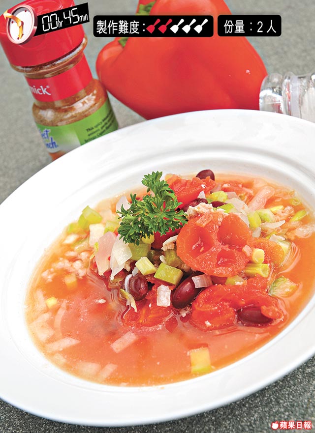 3.下雞湯、水,煮至滾起後下番茄,加入鹽及胡椒粉,最後下辣椒粉上碟即成。