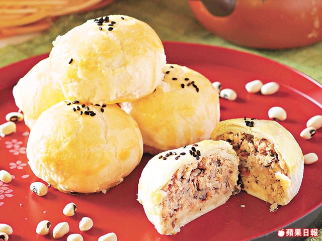 月餅皮以水皮和油皮來做,焗出來特別鬆化,加入眉豆餡,好香好軟熟。