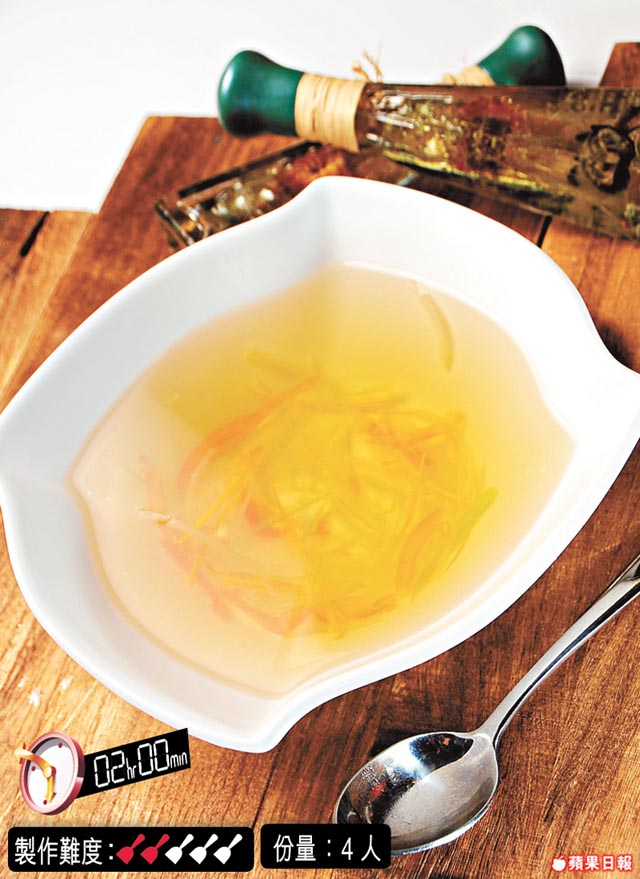 3.煲滾後用笊籬隔去湯渣成雞清湯。