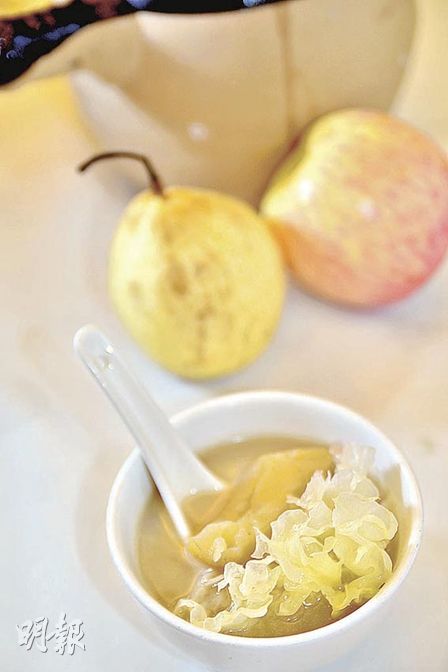 功效﹕潤肺生津,滋陰健脾。雪耳味甘、淡、平,潤肺止咳,滋陰和胃;蘋果性味甘、涼,生津潤肺,開胃止瀉;雪梨性味甘、微酸、涼,有生津潤燥,清熱化痰之效