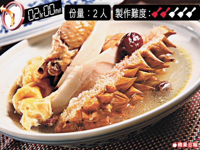 榴槤殼/榴槤肉各 250克、椰子 150克、薑(切片) 20克、水 1,500毫升、雞半隻、紅棗 40克、鹽少許