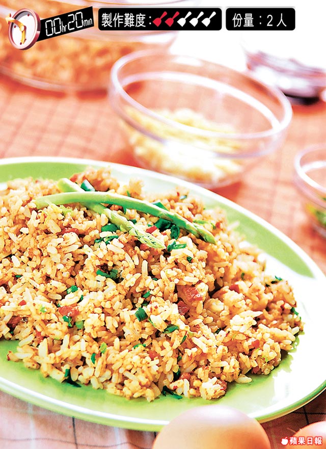 蛋黃 2隻、冷飯 2碗、火腿粒/葱花/蝦皮/醬油各 1湯匙、蝦米辣醬 2茶匙