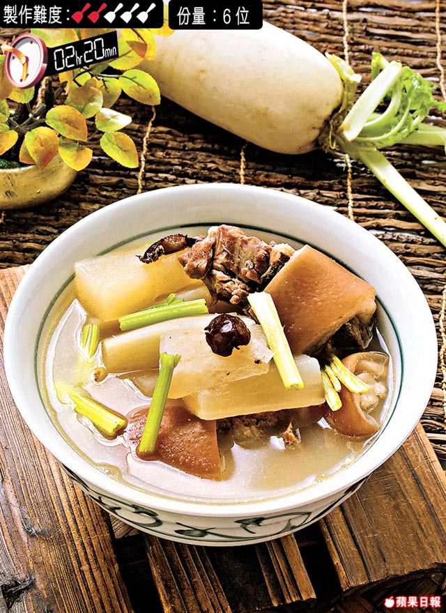 4.加入白蘿蔔、雞心棗,蓋上蓋,滾起後收中細火煲 1 1/2小時,加鹽,下唐芹即成。