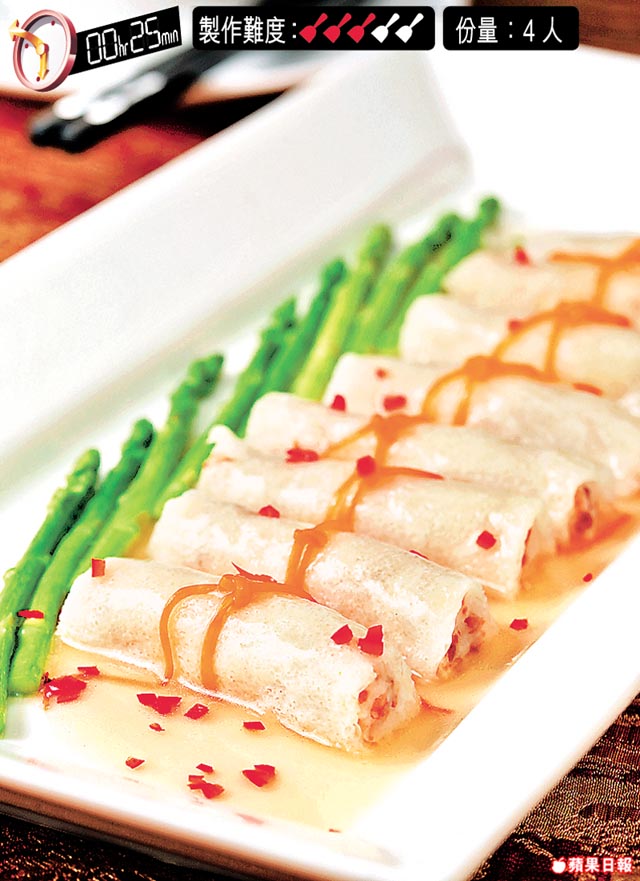 6.將細蘆笋排碟上,放上竹笙卷,淋上薄芡即成。