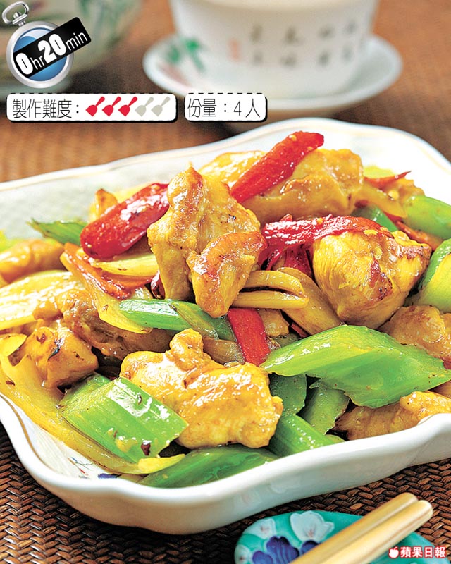 新鮮雞(去骨連皮) 1/2隻、西芹段 6安士、洋葱條 3安士、薑片/黃薑片各 1安士、乾葱(切片) 3粒、蒜頭(切片) 2粒、紹酒 2茶匙