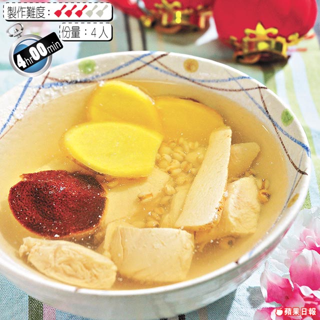 健脾袪濕、化痰利水、有輕身的功效,每日一次,直至見效為止。 材料 薏米/淮山各 1両、雲苓 8錢、荷葉/浙貝各 5錢、竹茹 4紮、雞胸肉 1斤、薑 3片、陳皮 1小塊、鹽少許、水 2,800毫升 做法 1.薏米、雲苓、荷葉、竹茹、浙貝洗淨後浸水 15分鐘,放入魚湯袋內。 2.陳皮浸軟刮瓤。淮山浸水 2小時,備用。 3.煲內放入魚湯袋、陳皮、淮山、薑、水、雞胸肉,煮滾後,改慢火煮 1 1/2小時,加鹽即成。 資料來源︰蘋果日報2012年01月31日 0 0 0 書籤 留言 (0) 登入即可留言 poon.hp 2025年01月07日 16:34 好 0 舉報