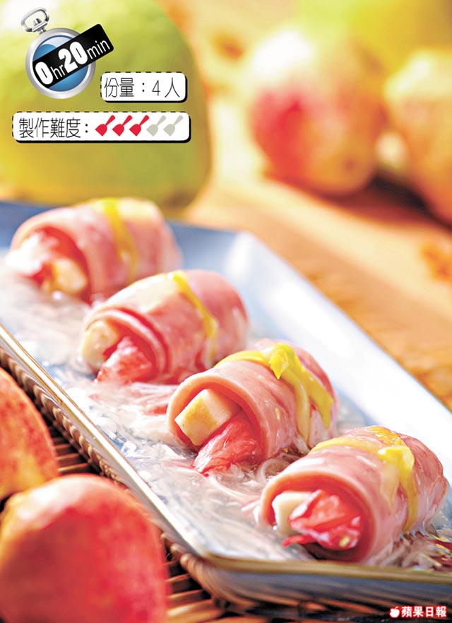 3.火腿片攤平,放上原條蟹柳、胭脂紅果條,捲起,用韭黃綁實成卷。