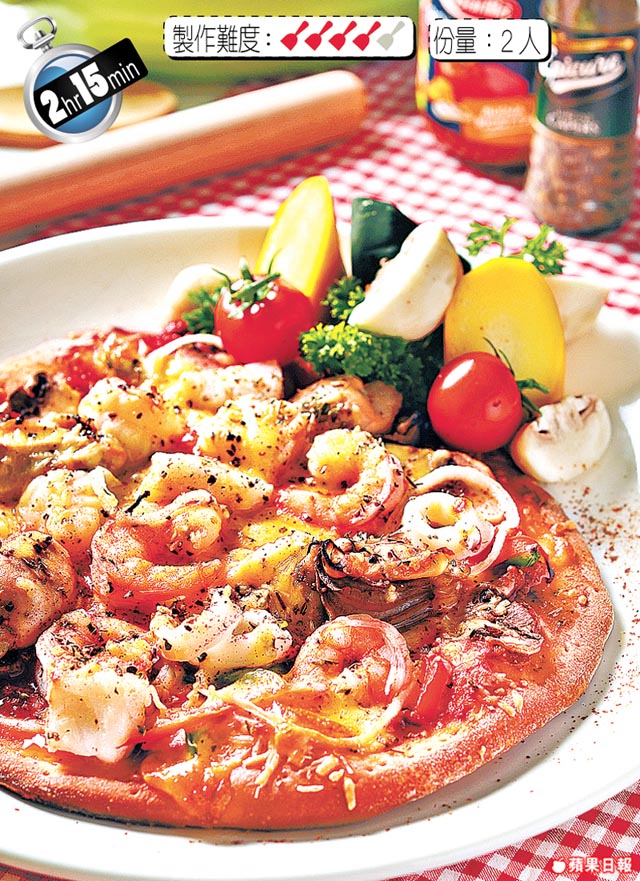 餡料:蝦仁/魚柳粒/蠔/魷魚絲各 100克、軟芝士/硬芝士各 4湯匙、番茄醬 125毫升、彩椒(切絲)/洋葱(切圈)/蘑菇(切片)各 10克